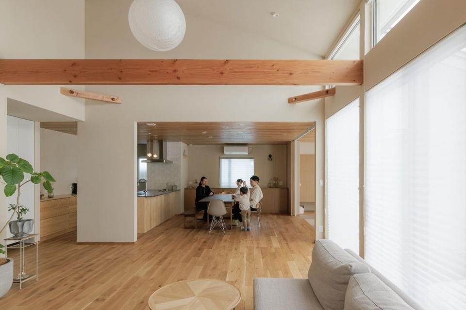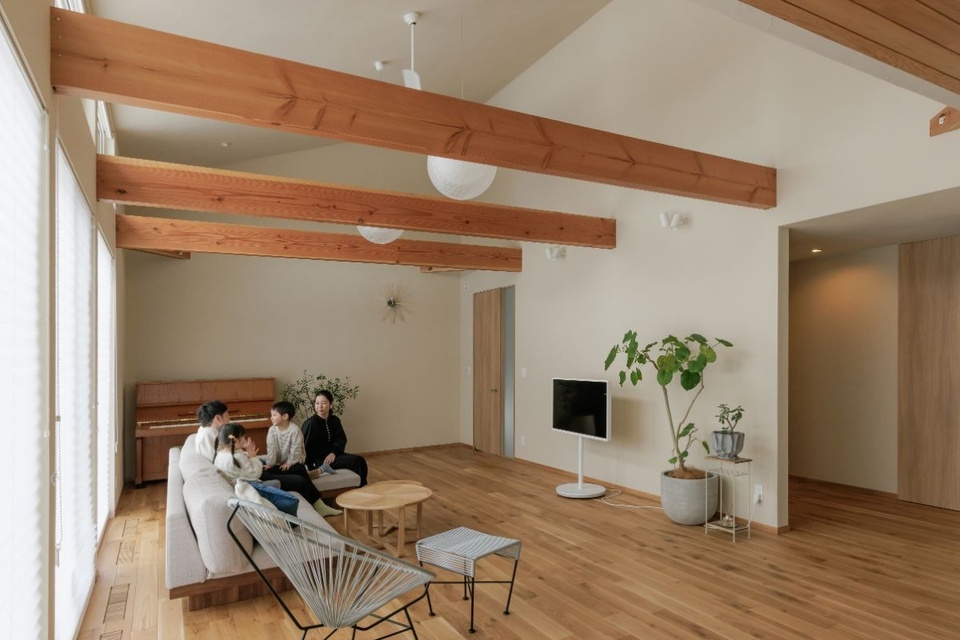 カラマツの梁にナラの無垢床……木の質感あふれるLDKでそう話してくれたのは、Sさんファミリーです。「リビングは子どもたちがここにいる間も、巣立った後も家族の生活の中心」と、各部屋の広さにメリハリをつけたいというのが要望の1つでした。