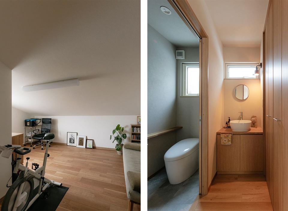 2階にはご主人の趣味の部屋(写真左)も。トイレの手洗い(写真右)は造作。家全体を統一感あるデザインで仕上げました。