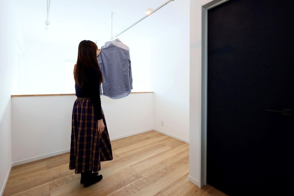 日当たりの良い2階ホールは、洗濯物を干すスペースとしても活用しています。