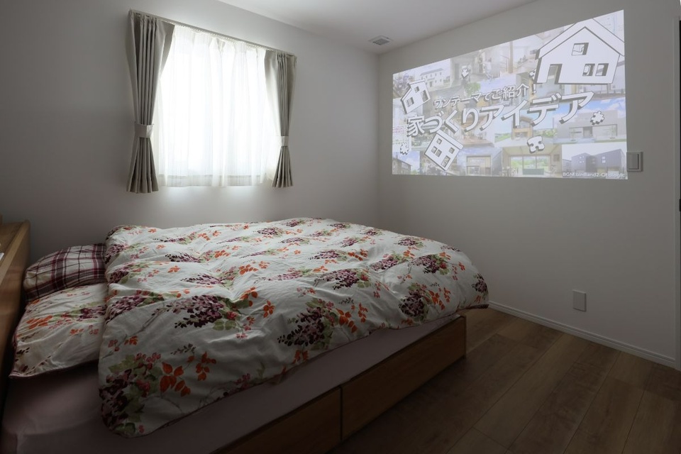 寝室にはプロジェクター機能付きの照明を設置し、カーテンを閉めれば、くつろぎながら視聴できるシアタールームになりました。娘がお気に入りのテレビ番組やオンライン動画も見られるので、休日のひとときを親子で満喫しています。