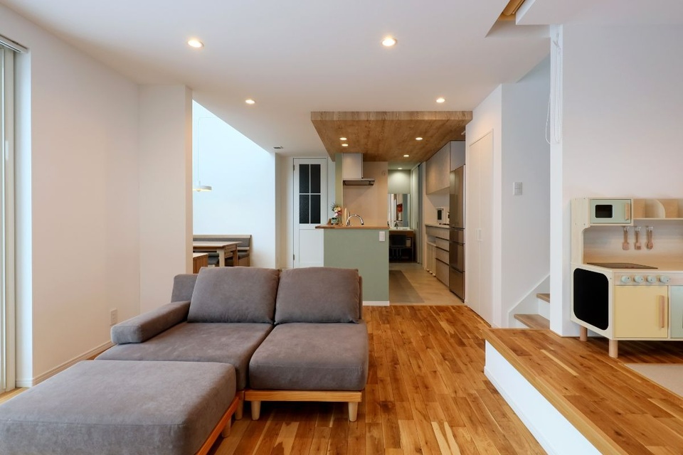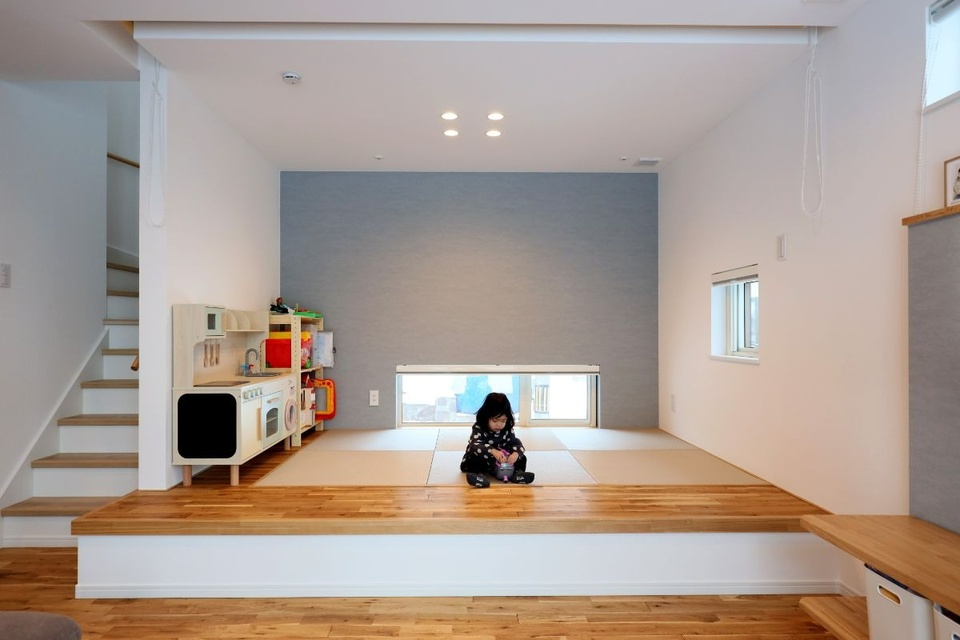 リビング横の小上がりは、娘さんのプレイルームとして活躍中。座っておままごとをしたり、時にはゴロンと寝転んでみたり、のびのび過ごしています。畳の下は大容量の床下収納。娘さんが保育園で制作した工作やアルバム、赤ちゃんの頃に使っていたベビー用品など、たくさんの思い出の品を保管しています。