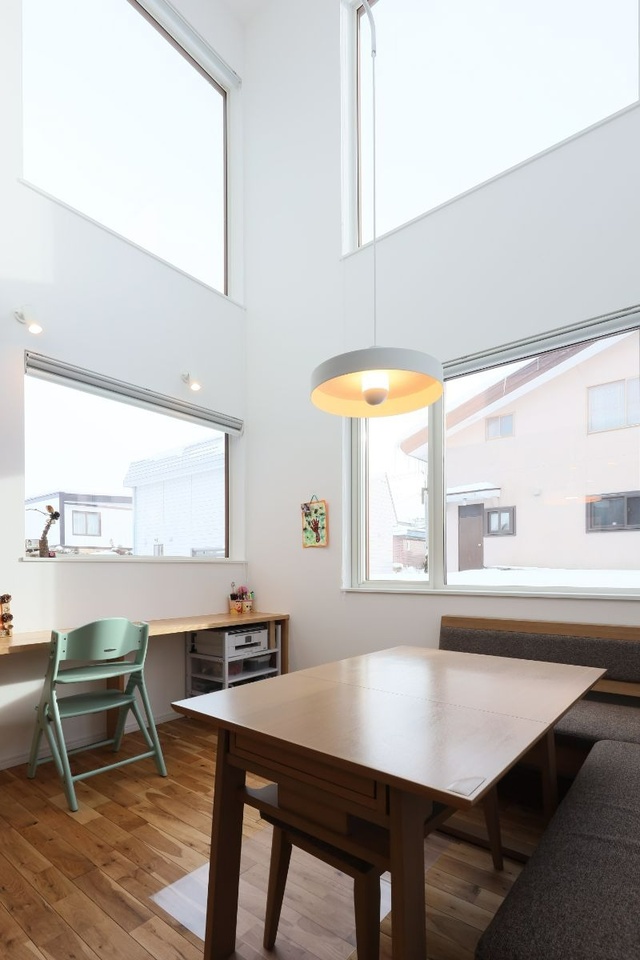 ダイニングの上は吹き抜けに。東と南の窓からたくさんの光が入り、明るい空間になりました。春になると窓からは庭の風景を楽しめます。