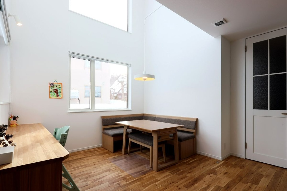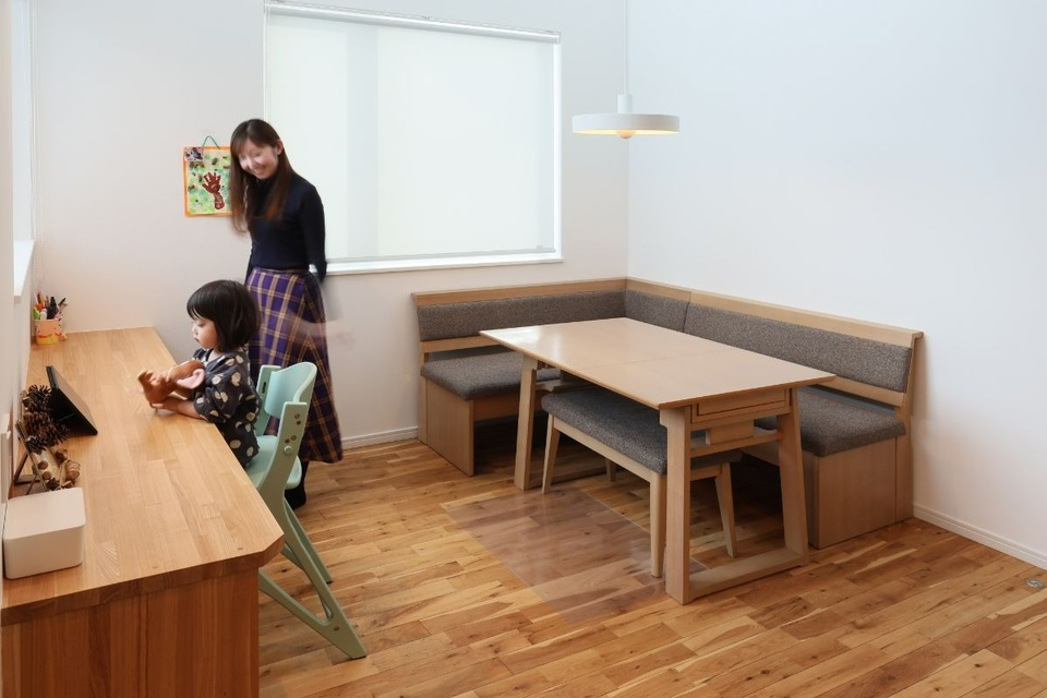 ダイニングに置かれたテーブルとベンチは「家具店に何度も通って選んだ」というご夫婦の大切なもの。リビングワークは、このダイニングセットを活かすプランを提案。リビングやキッチンと独立したスペースを造ることになりました。