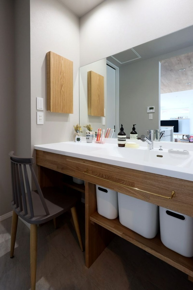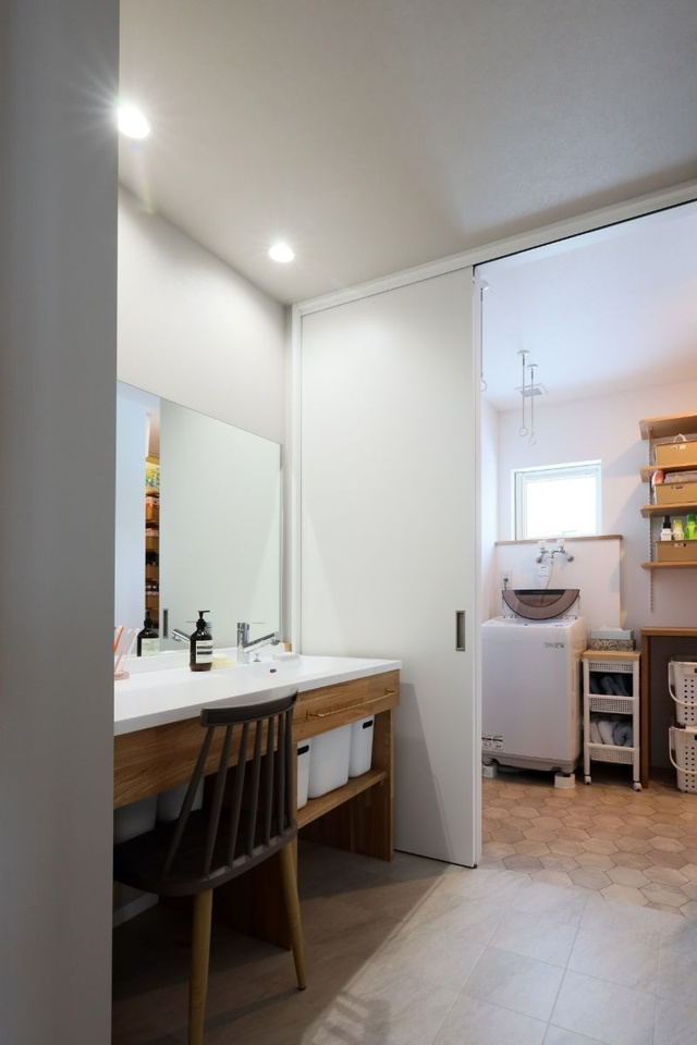 洗面室は奥にある脱衣室と分かれているので、将来、娘さんが大きくなった時にもストレスなく使うことができます。