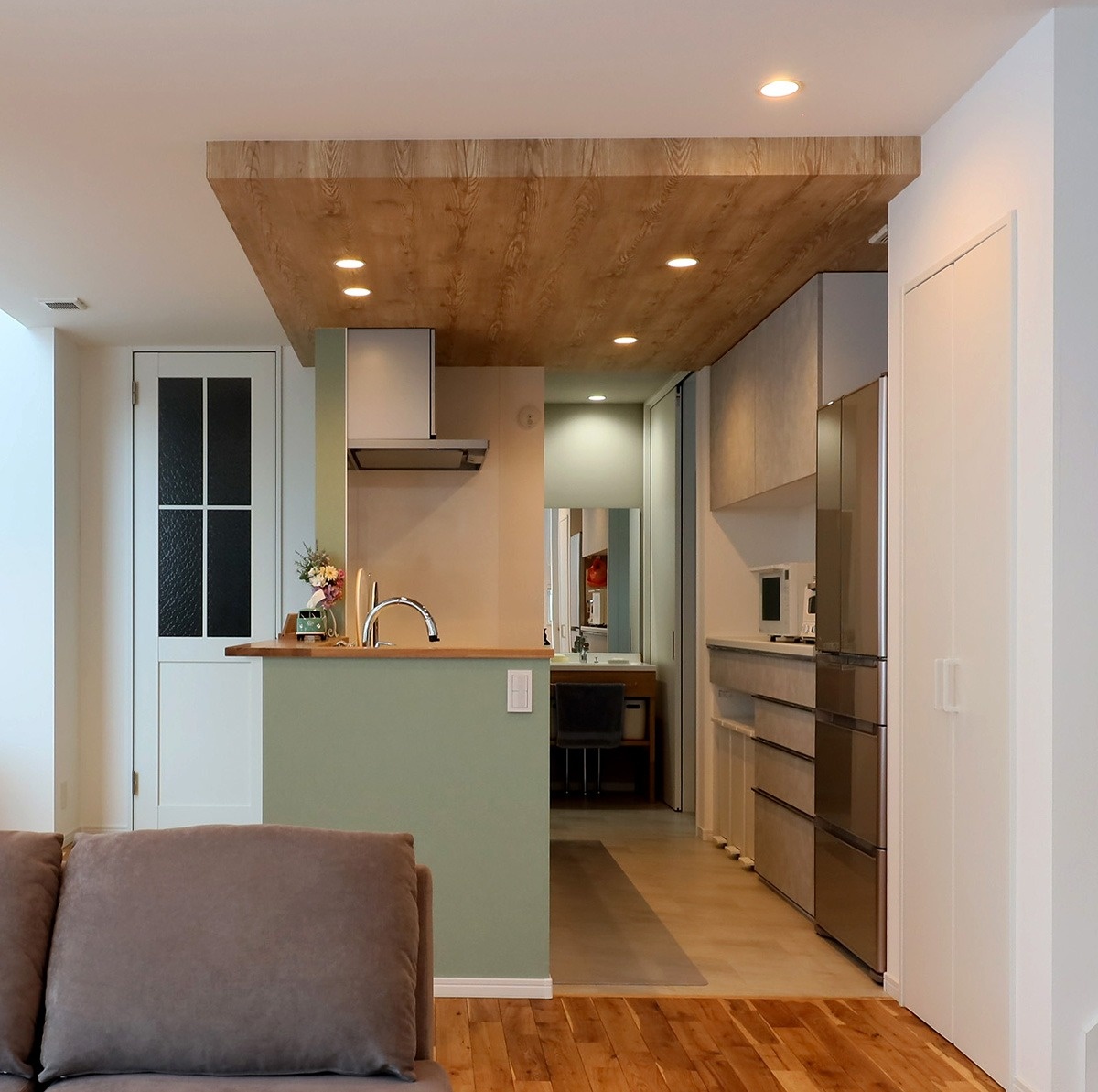 キッチンは木目調の下がり天井になっており、さりげなく空間を分けています。背面には上部に吊り棚、カウンター付き食器棚があり、調理器具や食器をたくさん収納できます。