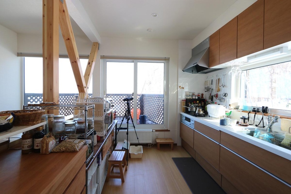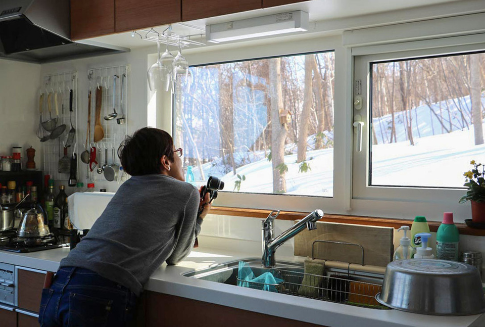 裏山にくる野鳥のバードウォッチングも趣味になっています。このキッチンが特等席です。雪原に付く足跡を発見して、何の動物の足跡なのかとご近所さんと話すのも楽しい。コミュニティーにも恵まれています。