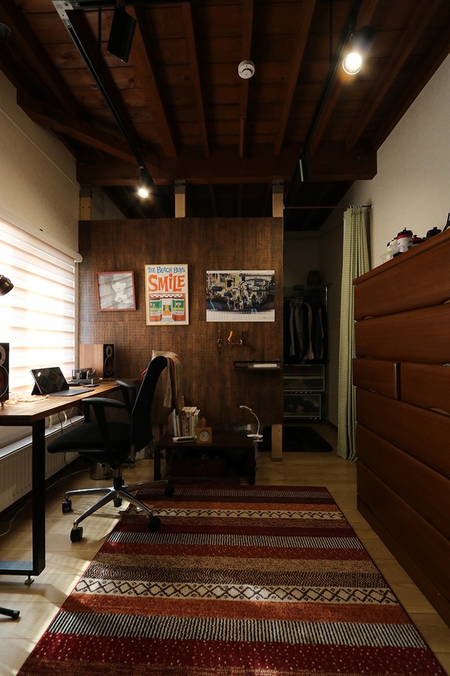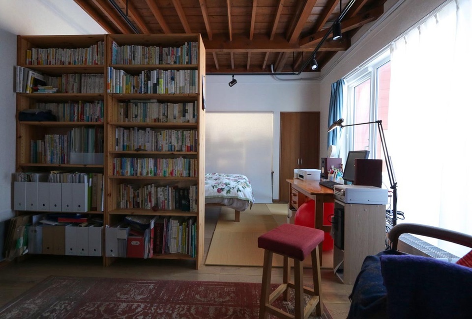1階には夫婦の個室と、浴室・洗面室があります。こちらは奥さまの部屋。本や仕事の資料がびっしり詰まった本棚を間仕切りにした、知的で落ち着いた空間です。明るい窓際にはデスクを配置しています。現しの天井も良い雰囲気です。