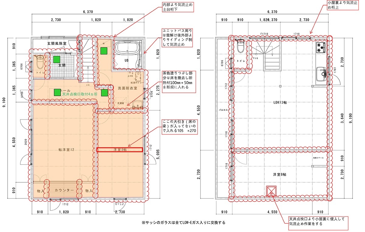 ※外壁、間仕切り壁の中などに、断熱材が入っていても、その中を冷気が通ってしまうと家が暖まらないため、あったかハウス河合建築事務所では対策として「気流止め」工事を行っている