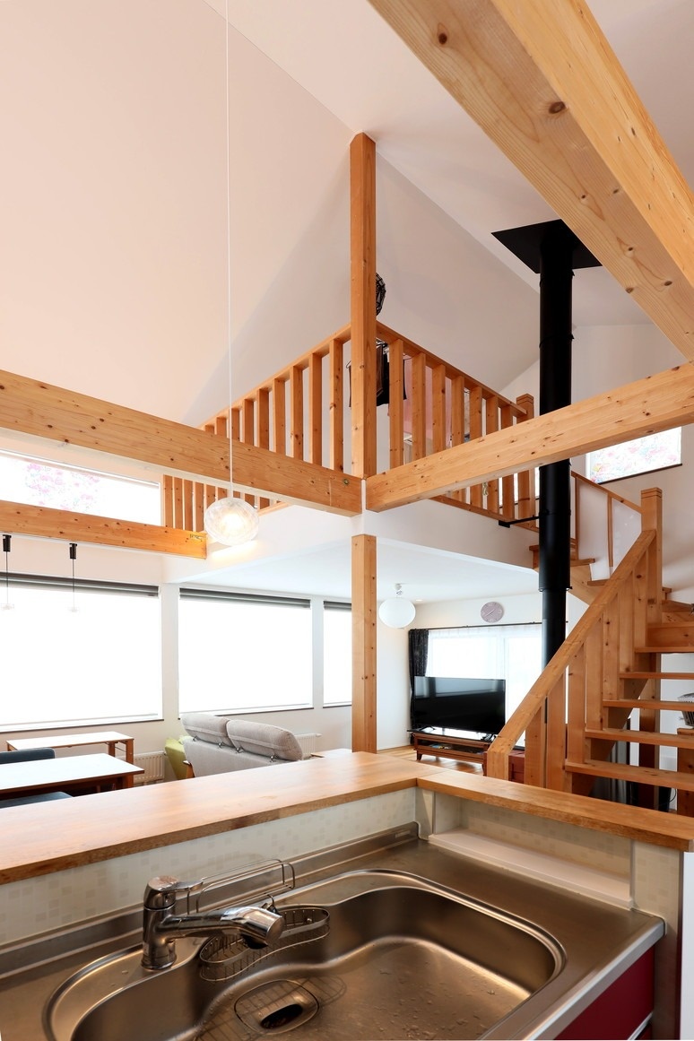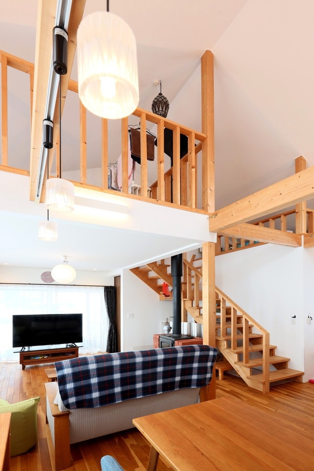 LDKの中心には薪ストーブがあり、空間全体を暖めています。2つのロフトは、テレビを観たり、洗濯物を干したり、ストレッチをするスペースとして活用しています。