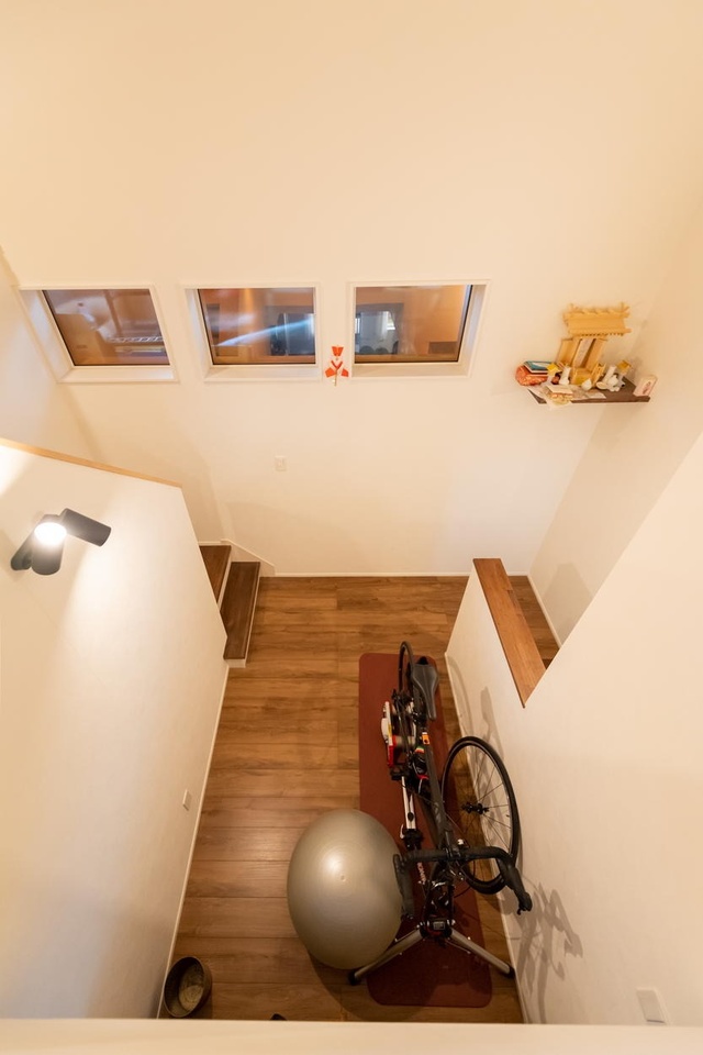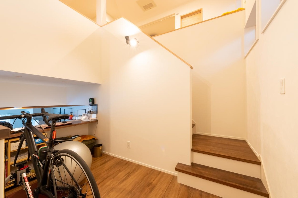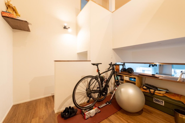 その途中にはスキップフロアを設けました。ほどよい“お籠り感”があり「秘密基地のような場所」(Iさん)。サイクリング用クロスバイクを手入れしたり、バランスボールでエクササイズをしたりと、趣味に没頭できるスペースです。