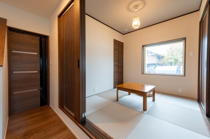 リビング横には、「実家にあったような畳スペースがほしかった」(奥さま)ことから小上がりの和室をつくりました。お客さまが来た時には泊まってもらう予定。奥さまがセレクトした和モダンな照明によって、和風旅館のような雰囲気です。