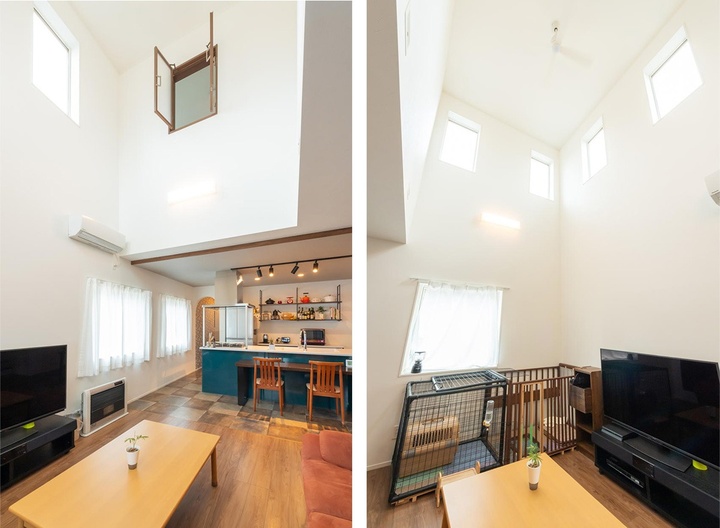 リビング上部の吹き抜けには、南側と東側に窓があり、外からの採光でバツグンの明るさ(写真右)。