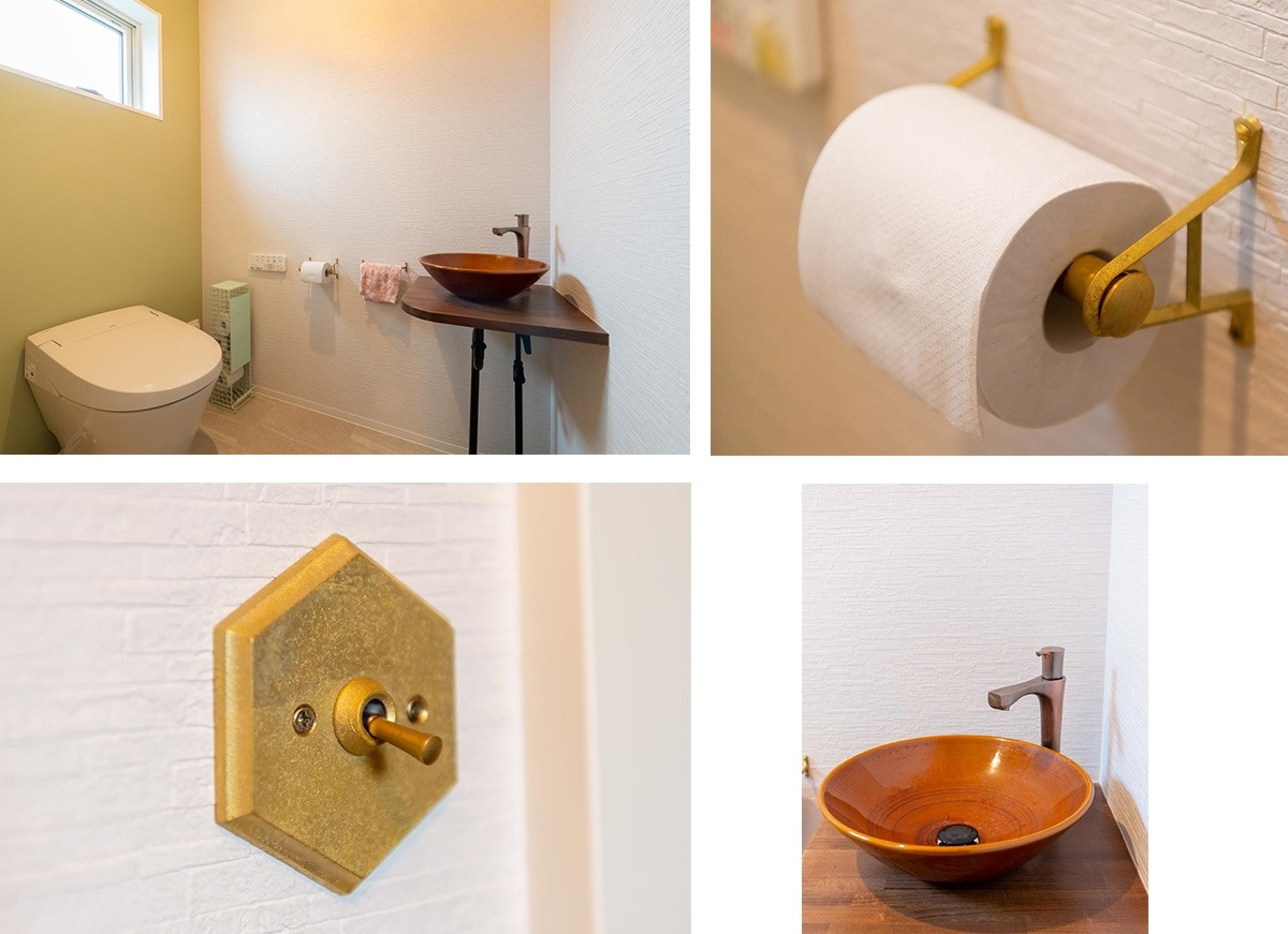 無機質になりがちなトイレも、ペーパーホルダーやスイッチ、手洗いの一つひとつにこだわり、温かみのある空間になりました。