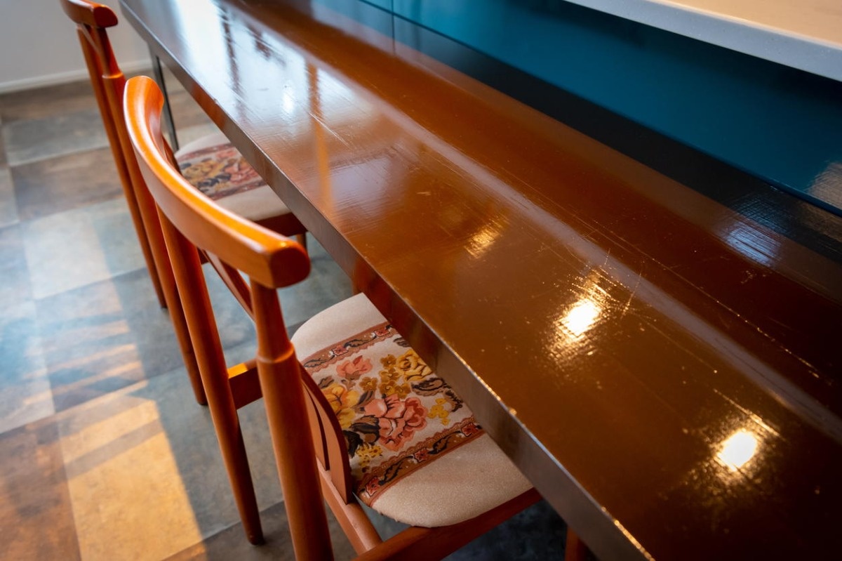 キッチンのカウンターテーブルは、既存の天板をキッチンに合わせて村上工務店がリメイク。使い込まれた艶感のあるアンティーク調に仕上げました。座面の花柄が素敵な椅子との組み合わせで、レトロで味わい深い雰囲気です。