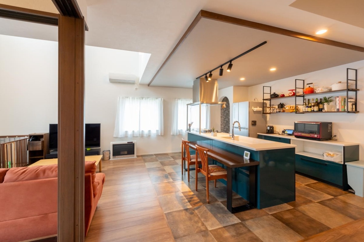 キッチンの下がり天井は、村上満社長の提案によるもの。下がり部分の木枠が空間のアクセントになり、キッチン・ダイニングとリビングとの空間をさりげなく分けています。