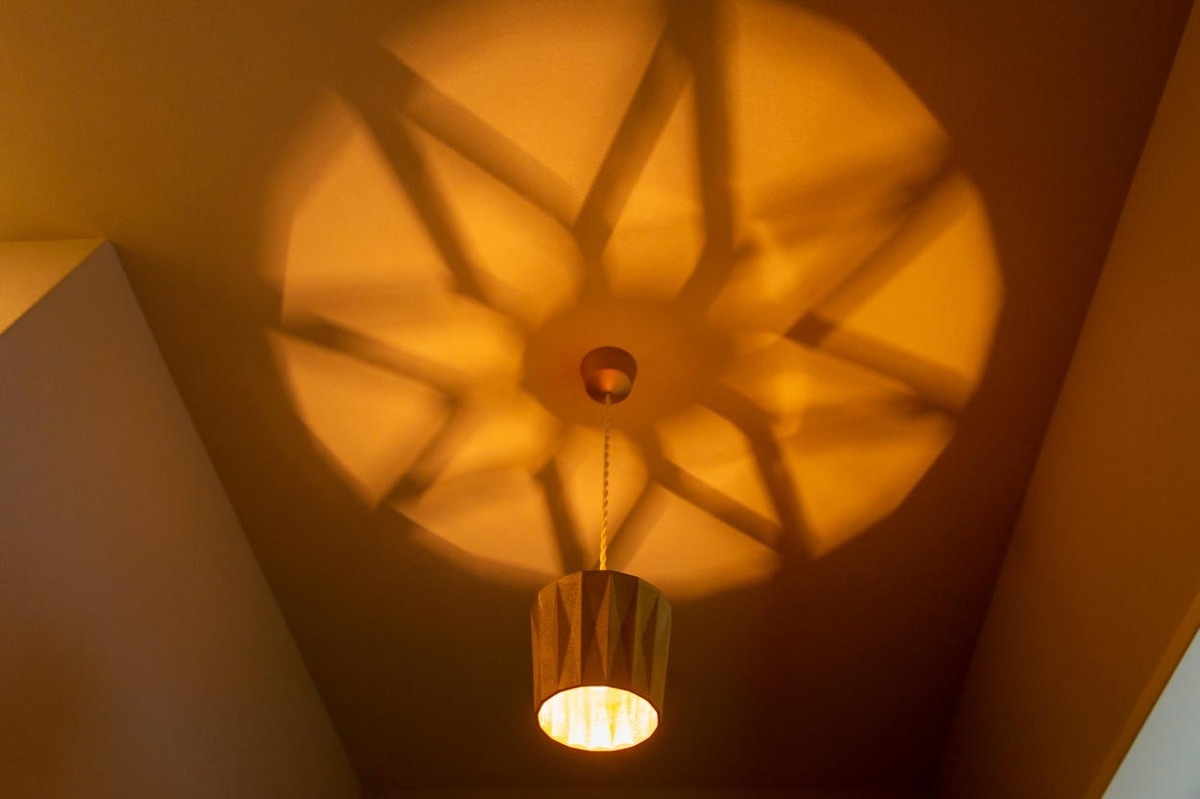 天井に花模様を映し出している玄関の照明もその一つ。注文してから「納品まで半年かかる」と言われ、ようやく手に入れただけに思い入れのある一品です。