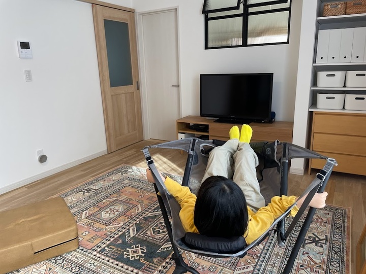 帰宅後、ひと休みする妹さん。アウトドア用品店で見つけたハンモックチェアはテレビの特等席です。