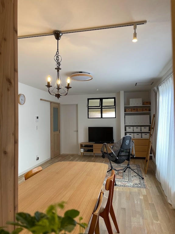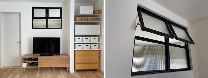 テレビの右横の収納棚は、学校関係のプリントや日用品がボックス収納できれいに整理されています。部屋のアクセントにもなっている開閉式の室内窓は、採光と通風の役割も担っています。
