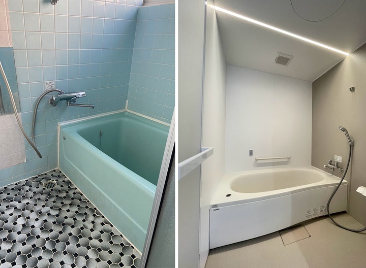 タイル張りだった浴室は、ユニットバスに交換しました。天井埋め込みタイプのライン状照明は、白色や電球色など、気分に合わせて変えることができ、入浴タイムが楽しくなったそう。