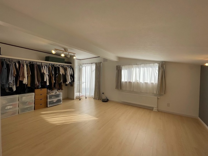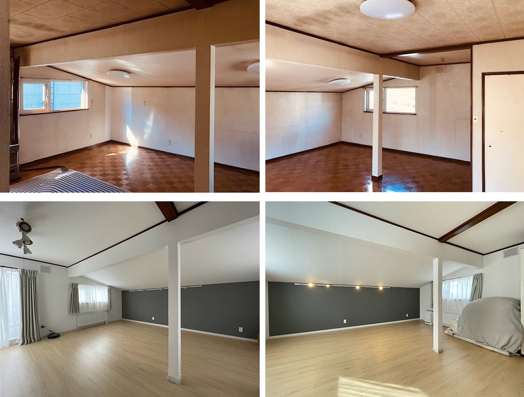 壁や床を一新し、今は家族の寝室として使っています。傾斜屋根が何とも居心地よく、グレーのアクセントクロスも素敵な空間です。