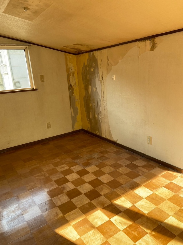 ここは納戸を増築して作られた洋室です。屋根からの漏水で壁にはカビが発生していました。
