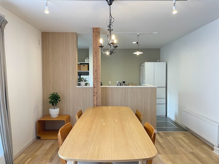 広くなったダイニングスペースには、奥さま念願だった大きなテーブルを置きました。長さ2m20㎝あるロングサイズで、食事をしながら娘さん達のスタディスペースとしても使えます。