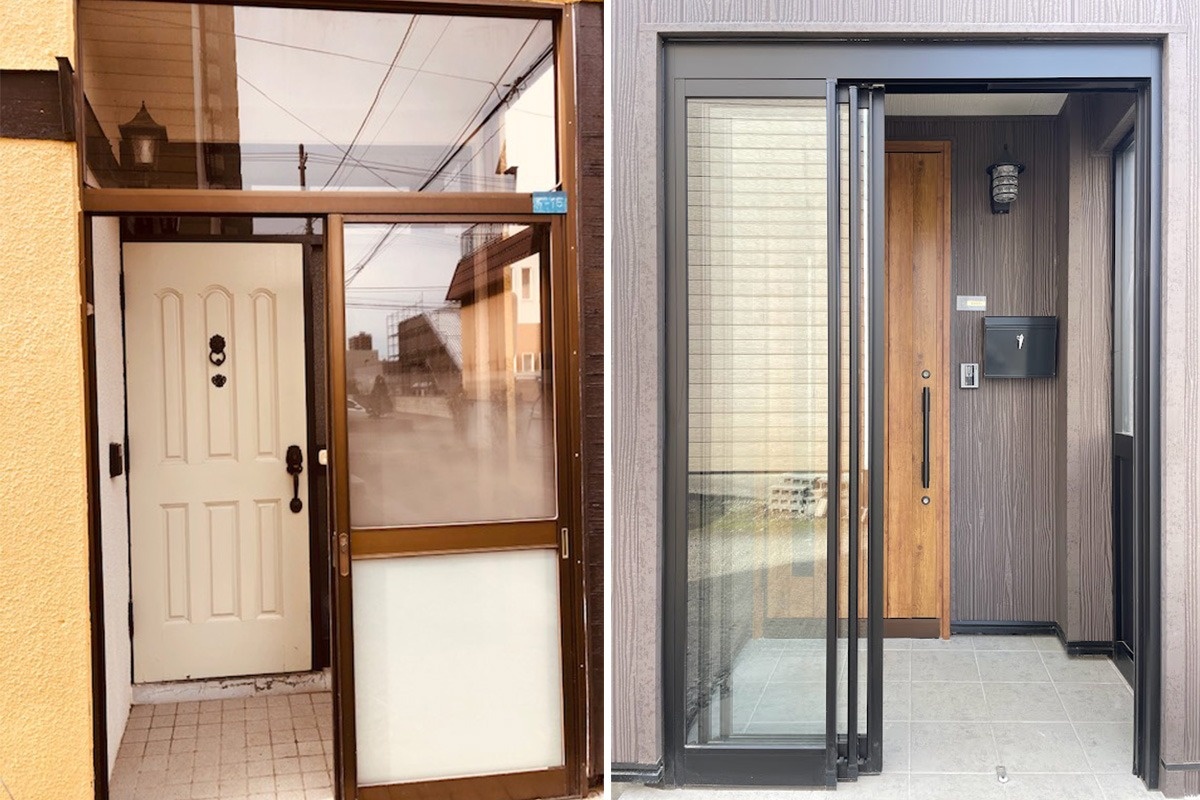 風除室、玄関ドアも外観に合わせたデザインに新調しています。