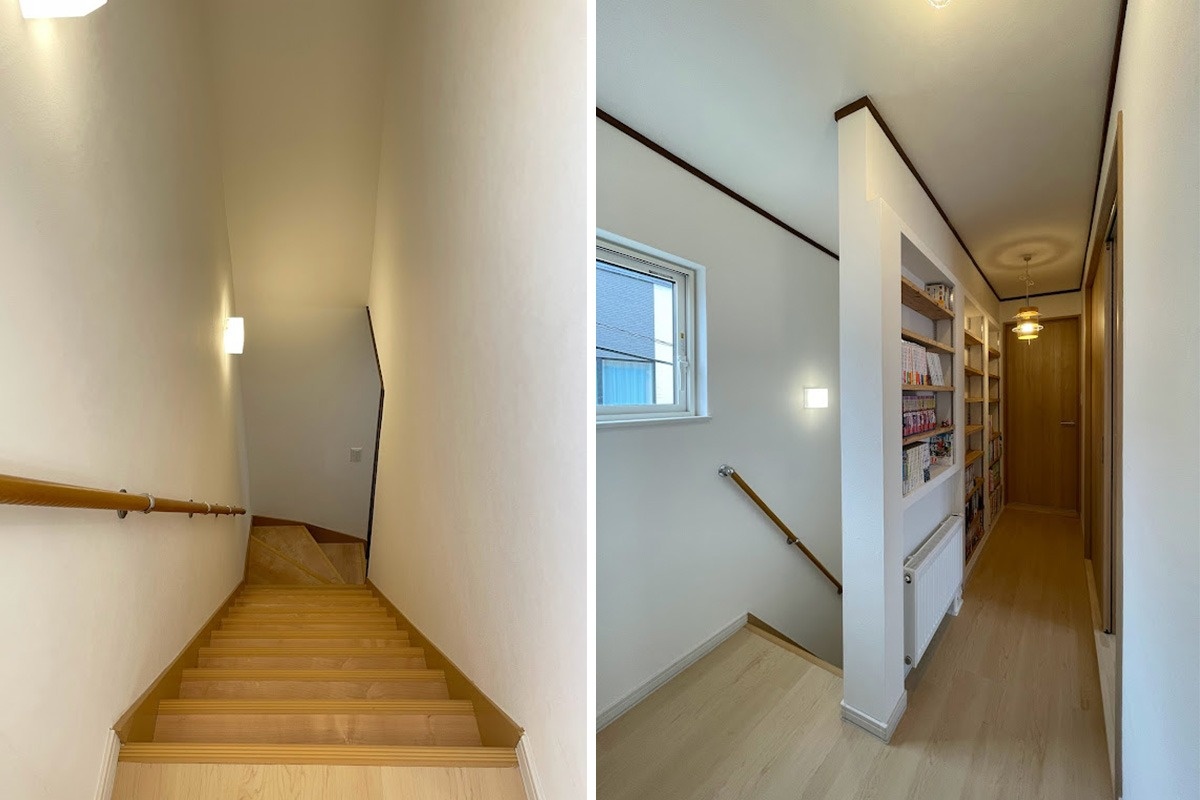 続いて2階へ。廊下には既存の壁を利用した本棚を造作。ご家族が愛読している本や漫画を全巻納めても、まだまだ余裕がある収納力です。