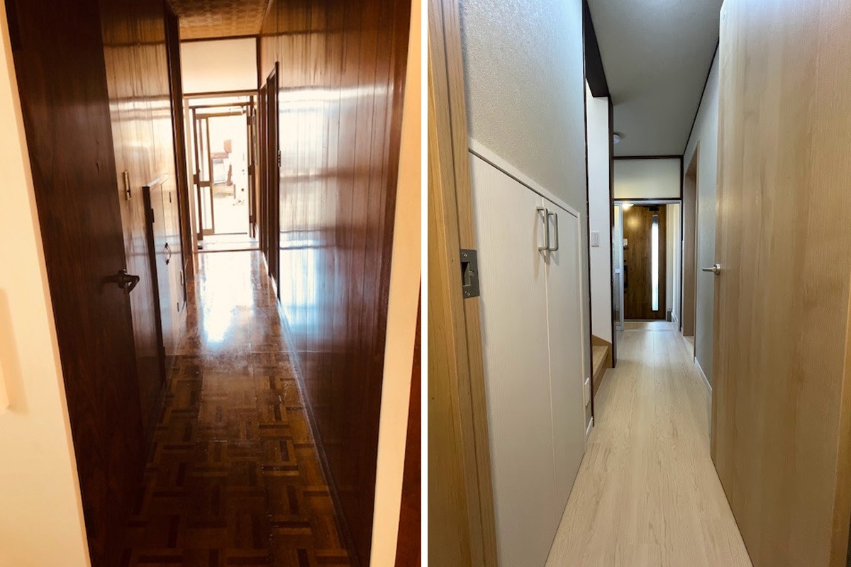 暗くなりがちだった廊下は、壁紙とフローリングを張り替え明るい雰囲気に。