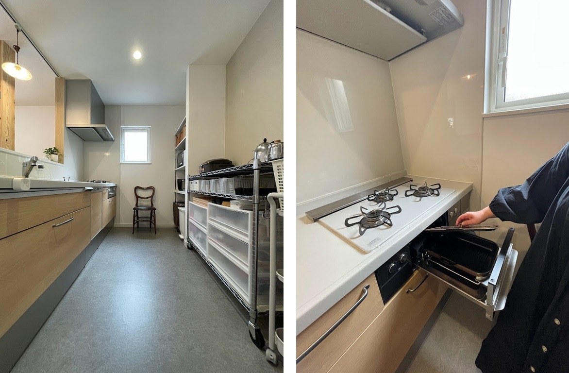 右/ガスコンロのグリルには焼き物調理専用のプレートが付いていて、グリル内の油汚れも少なく、家事の時短に役立っています。