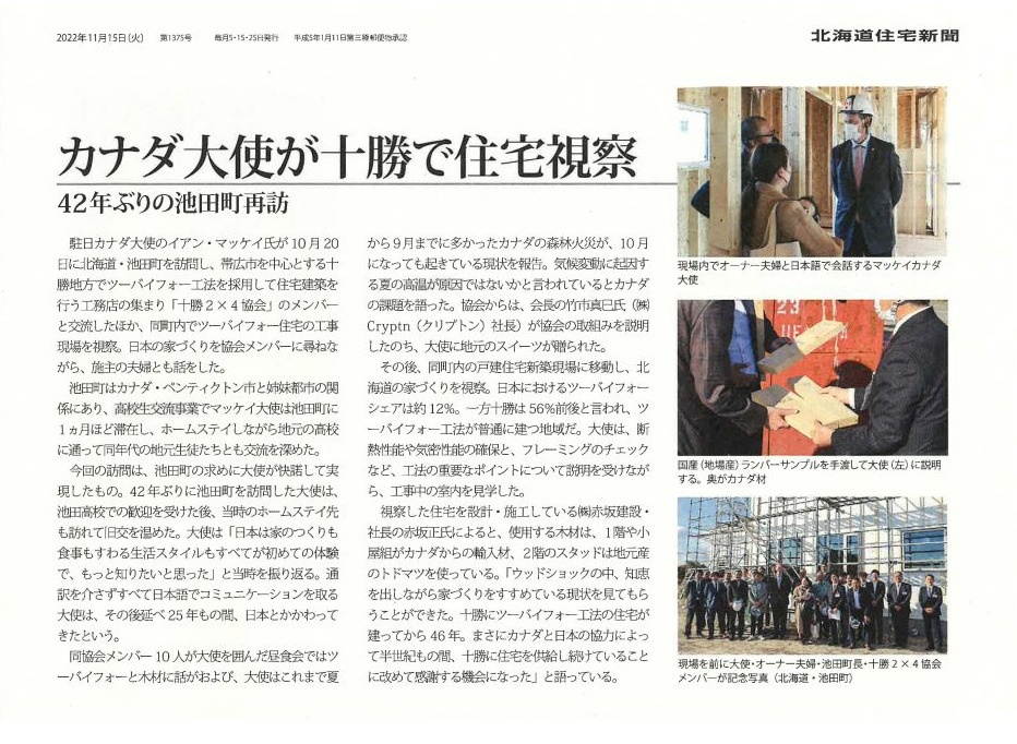 駐日カナダ大使のイアン・マッケイ氏が2022年10月20日に建築中のМ邸で断熱気密性能やフレーミングのチェックなどを視察した際の様子が住宅専門紙に掲載されました。