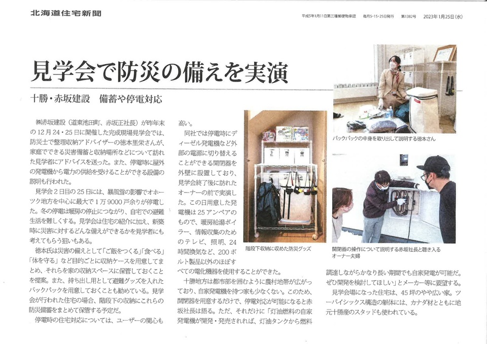 2022年12月24日、25日に開催した完成現場見学会では、防災士で整理収納アドバイザーの徳本里栄さんが、家庭でできる災害備蓄や収納場所についてのアドバイスを見学者に送る様子が住宅専門紙に掲載されました。