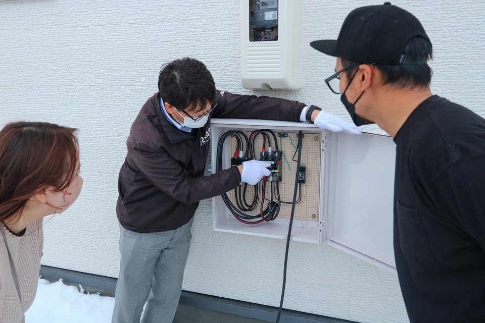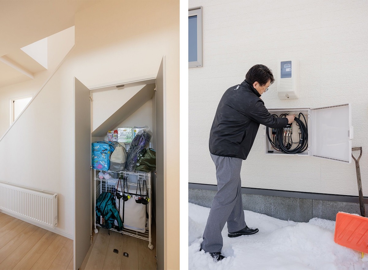 奥様が特に惹かれたというのが防災対策です。寒さの厳しい十勝では、暖房の停止につながる冬場の停電は死活問題。M邸では階段下(写真左)に備蓄をまとめて保管したほか、非常時には自家発電に切り替えが可能なよう、外壁に開閉器を取り付けました(写真右)。発電機をつなぐことで暖房から照明、テレビなど、停電時も普段とほぼ同じ電化製品が使えるようになっています。