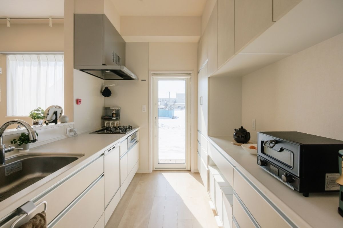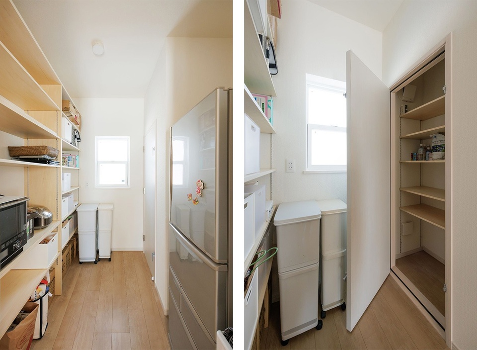 すっきりしたキッチンは大きなパントリーのおかげ。ストック品だけでなく、冷蔵庫、炊飯器やごみ箱なども収納しています。右奥の外気を利用した保冷室は、野菜を入れたり料理を鍋ごと入れたりと冷蔵庫代わりに活躍しているそうです。