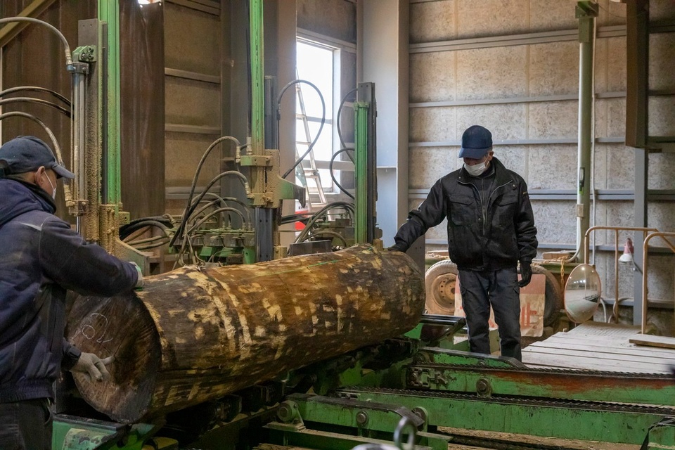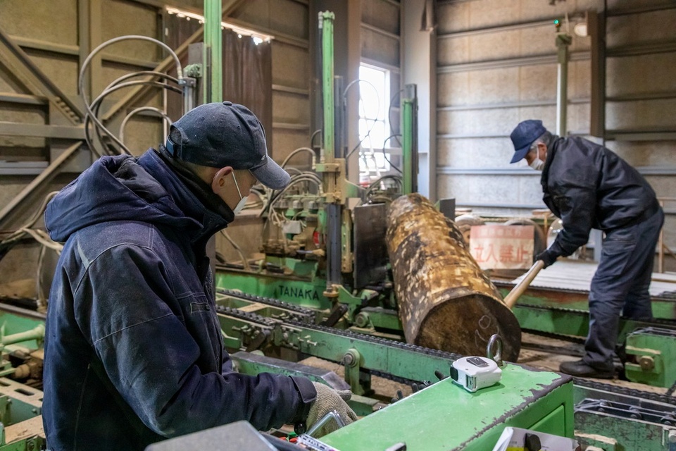 木目や木の特徴を瞬時に見極め、阿吽の呼吸で切り出し方を決めます。機械音が響く工場内は、ほとんど声が聞こえません。