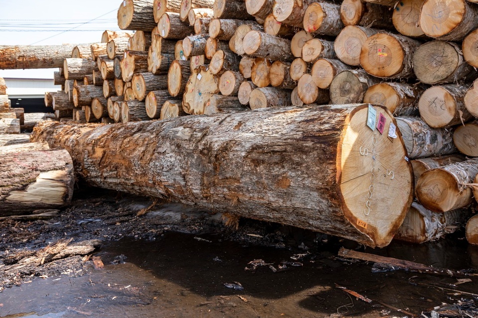 髙橋専務 この原木ヤードには、シラカバ、ザツカバ、クルミ(ウォルナット)をはじめ、約30種類ほどの広葉樹がストックされています。その半分以上が、北米からやってきたもの。丸太の状態は植物ですから、生鮮品と同様に、冷やして保管する必要があります。