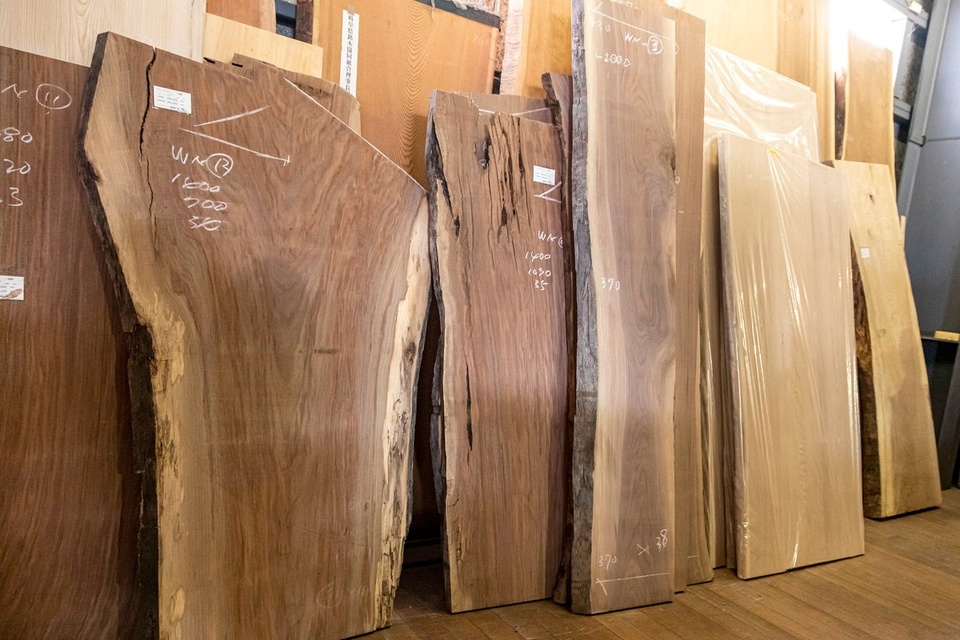 一枚板が保管されている倉庫には、樹齢を重ねた木が醸す凛とした空気が流れていました。