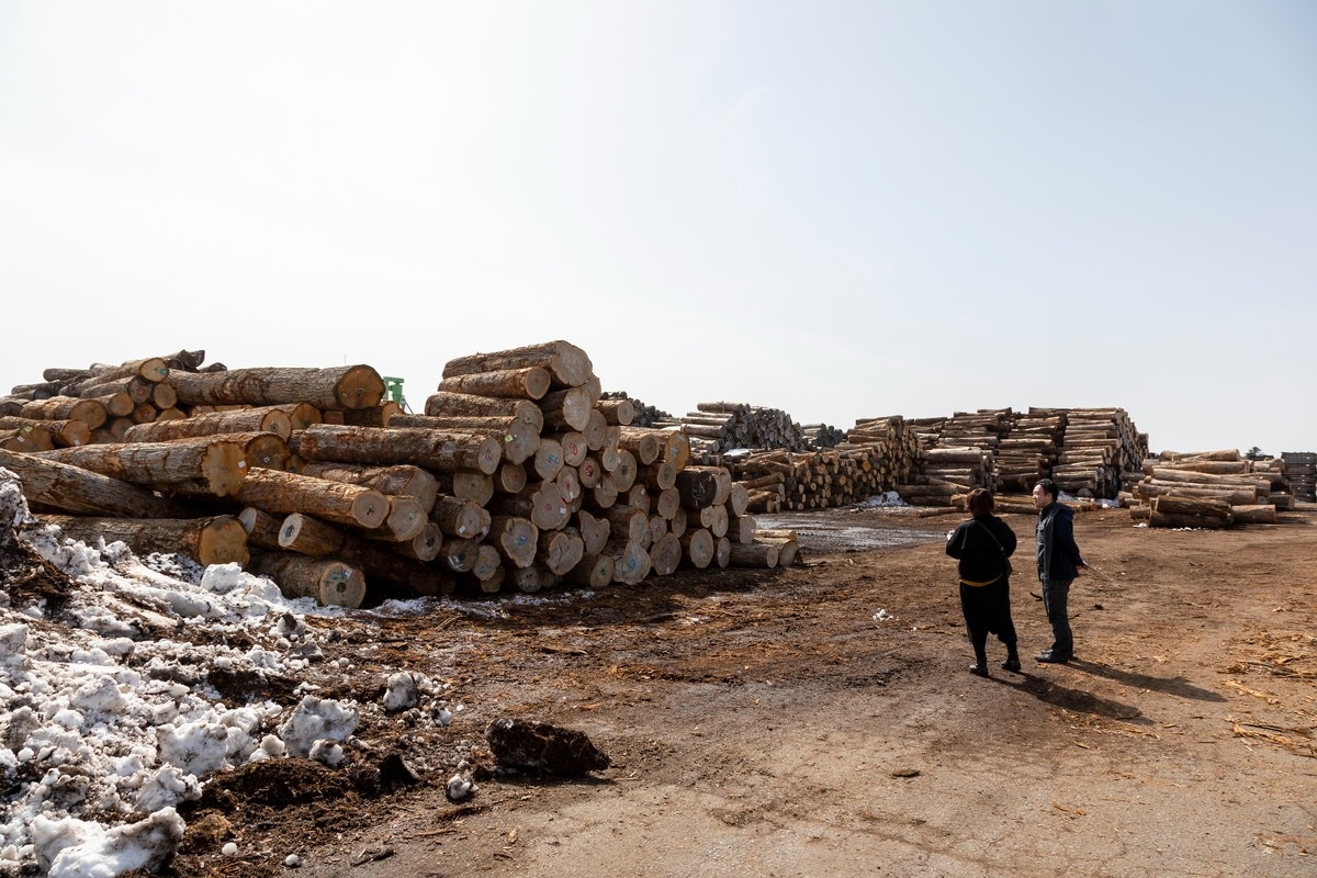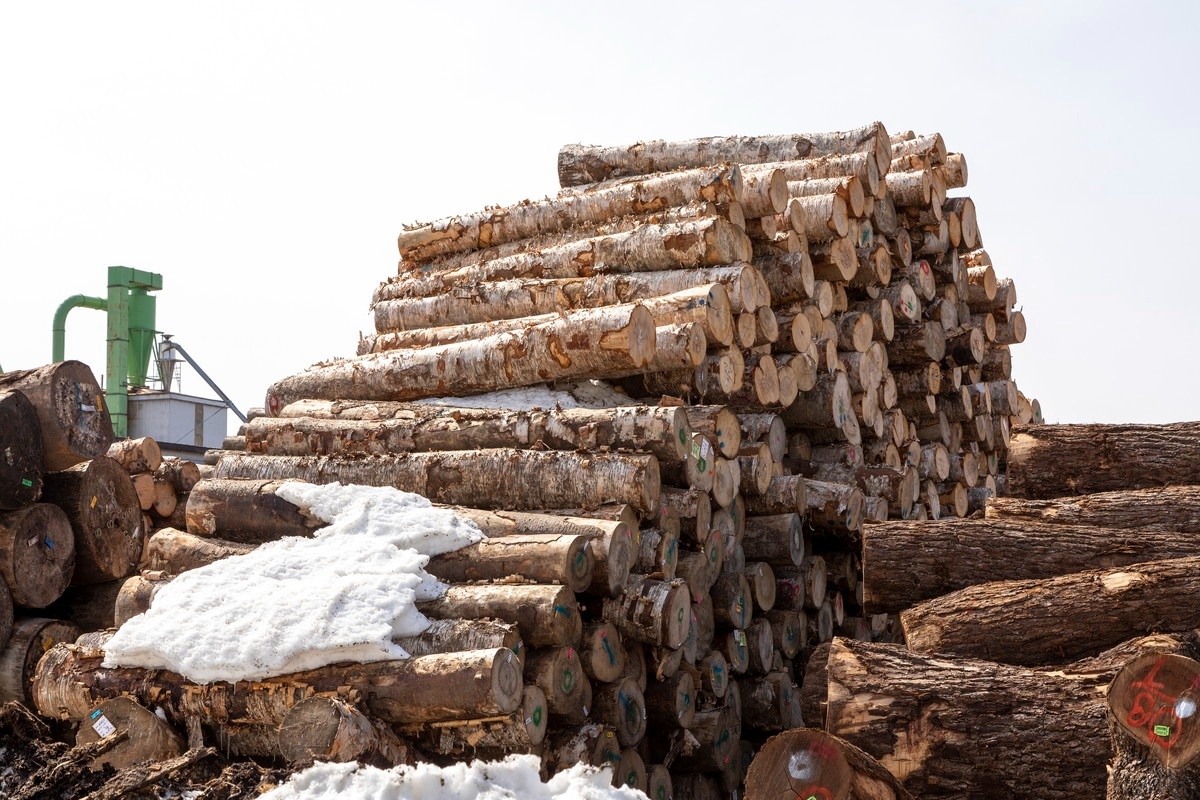 旭川工場を訪ねたのは2月の下旬。原木ヤードには、工場で加工する1年分の原木が山積みされていました。国内外から買い付けた広葉樹の丸太が重なる様は圧巻です。