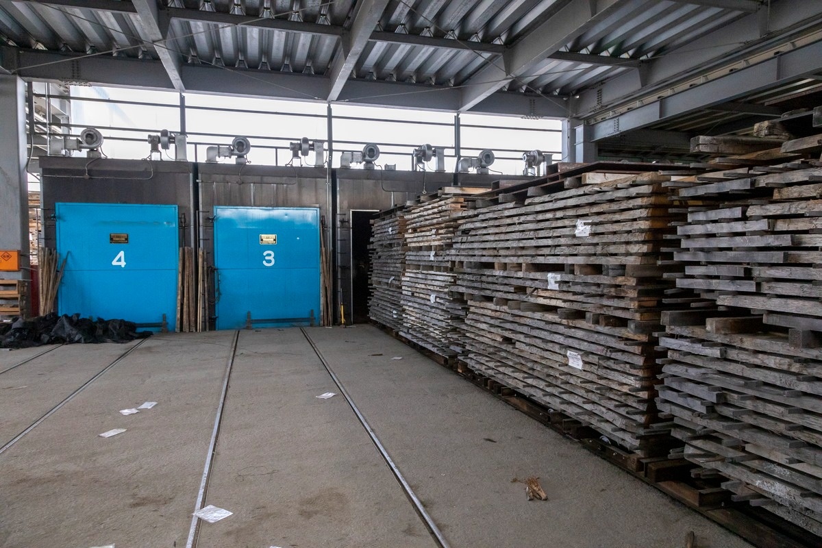 木の種類によって乾燥管理は変わるので、小回りが利くように、青い扉の乾燥室は計12個用意されていました。薪や木くずを燃やしたボイラー熱を活用し、最初は50度程度、後半は80〜90度まで温度を上げながら、2〜3週間かけて含水量が8%になるまで、ゆっくりと仕上げの乾燥を行います。