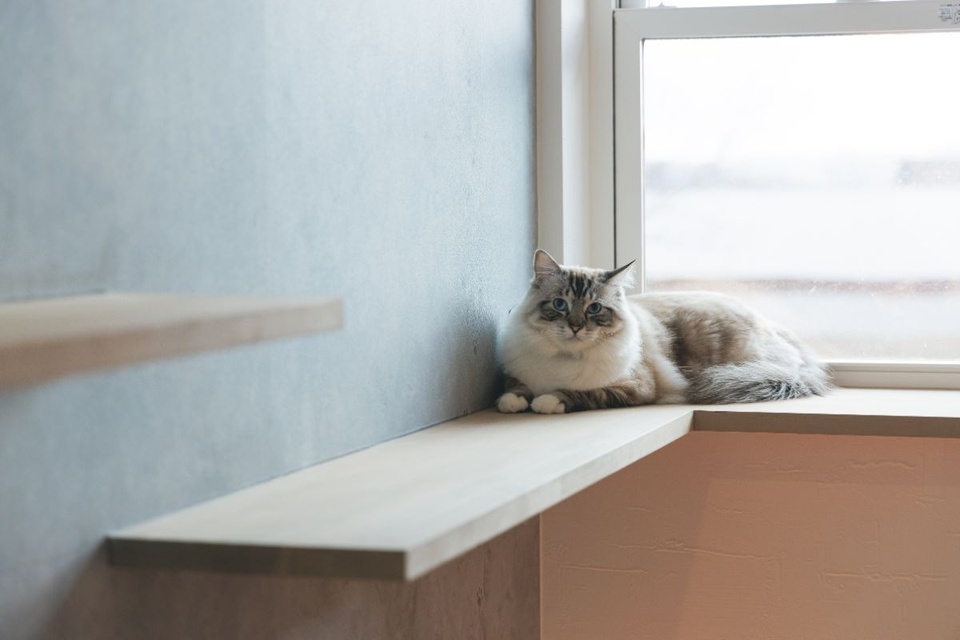 リリカラ社の壁紙は足跡入り、足跡なしの二種類を組み合わせて。2匹にとってもリラックスできる場所になりました。