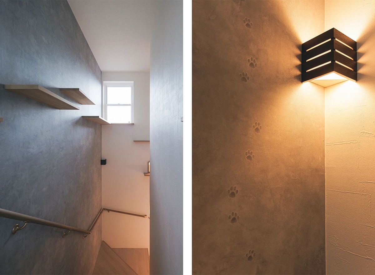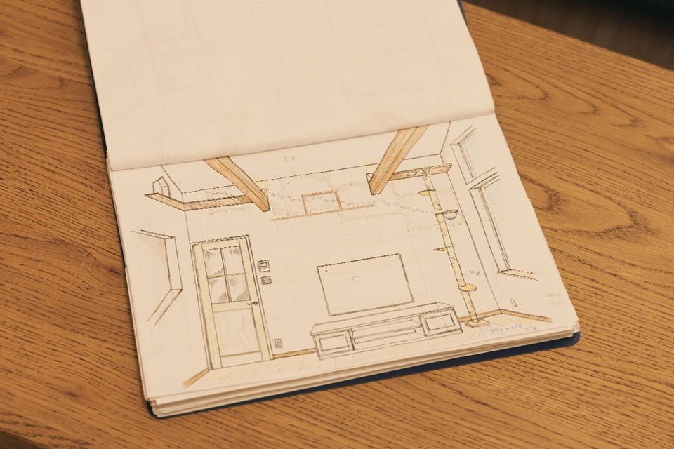 「八木さんも猫好きで、なんと東京まで行って猫に配慮した家づくりの研修会に参加してきてくれたんです。『壁の一部に猫の足跡模様の入った壁紙を使って、歩いた跡のように見せたい』という手間のかかる要望も、丁寧なスケッチを描いて思い通りの仕上がりにしてくれました」