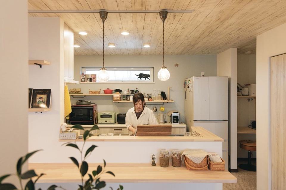 キッチンには木製のカウンターを設け、リビングとのつながりを感じさせるデザインに仕上げました。