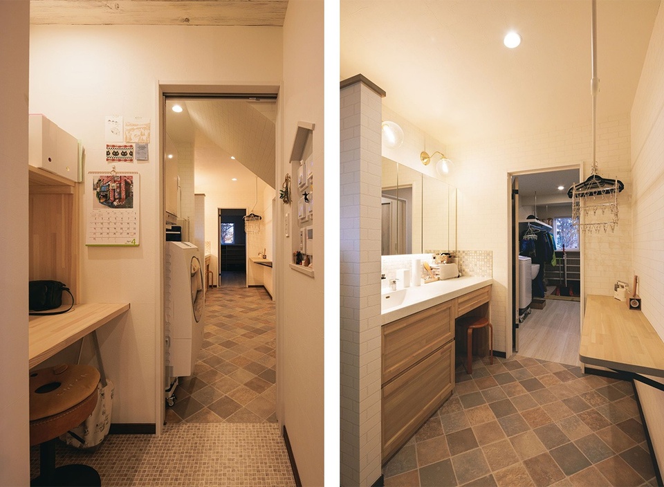 水回り動線の良さもこだわったポイント。キッチン横には書類を扱えるデスクスペースがあり、ランドリースペース・脱衣所・風呂場・洗面所を経て一直線に勝手口まで続いています。