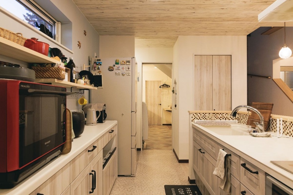 「ステンレスのアイランドキッチンなども見ましたが、お料理スタジオのような雰囲気ではない、暮らしに溶け込んだ場所にしたくて。天井の壁紙(サンゲツ/ RE51331)や三毛猫をイメージしたタイルなど、温かみのあるデザインに囲まれてとてもくつろげる場所です」