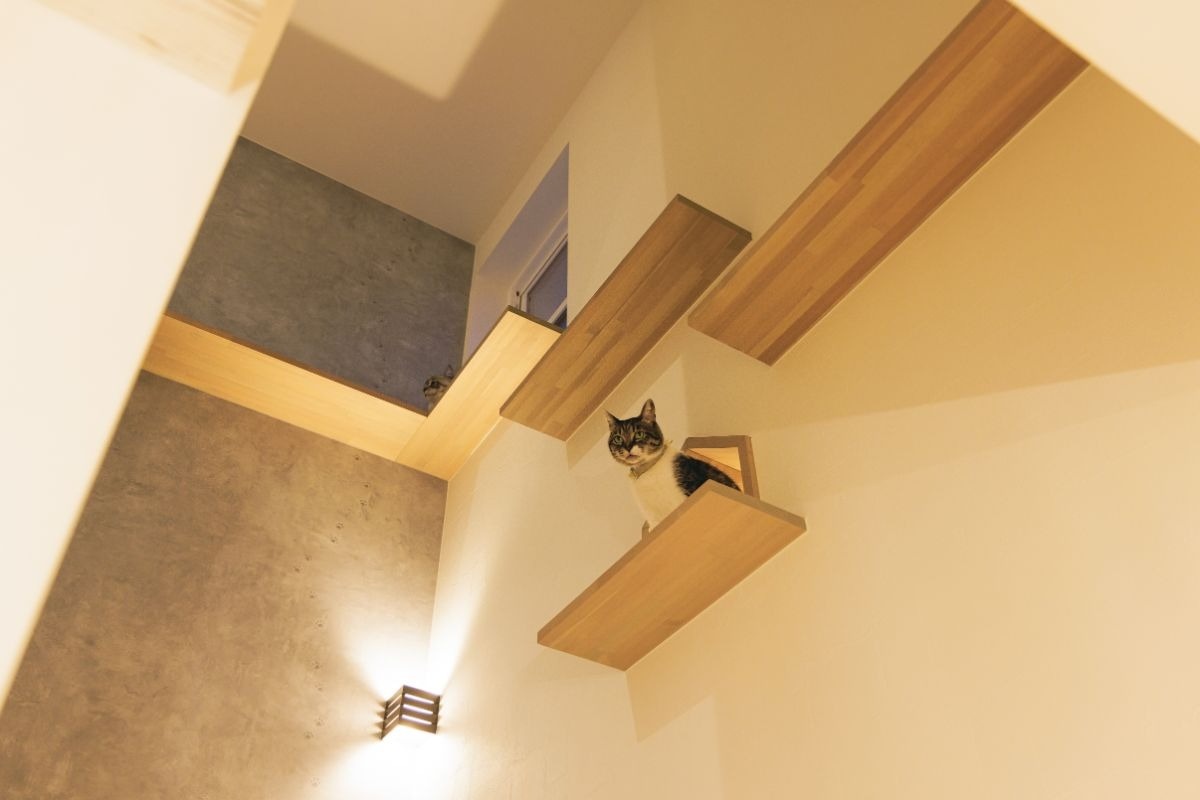 壁面いっぱいに造られたキャットウォークは、インテリアコーディネーターである八木睦美さんによる設計。猫の好きな幅や広さ、くぐりやすい形や安全性などに配慮してデザインされています。