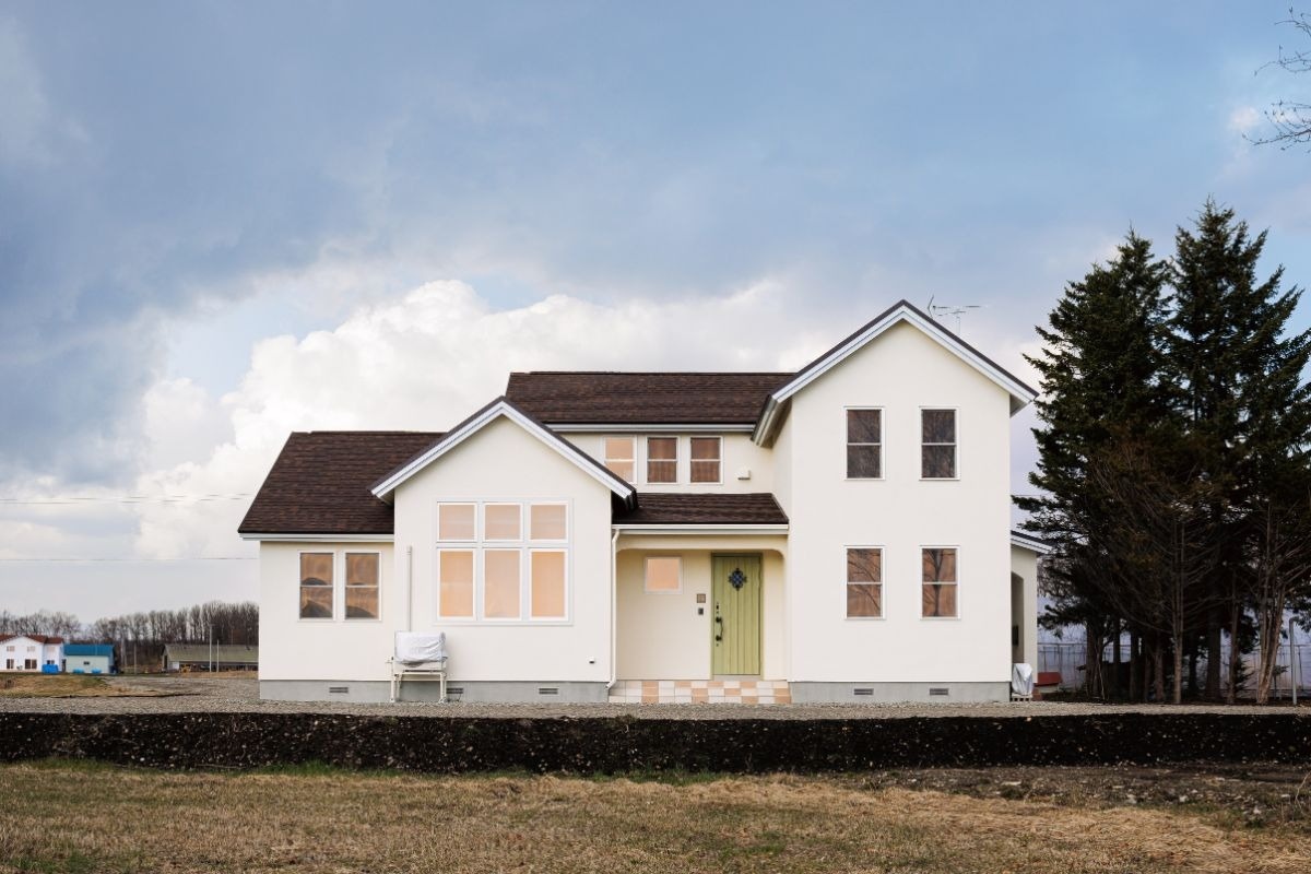 夕暮れの牧草地を背景に浮かび上がる特徴的なシルエット。あたたかな明かりの灯る窓の配置も美しいこの家に暮らすのは、鹿追町で酪農・畑作の混合経営をされているIさんご夫妻です。「結婚したら家を建てようと決めていた」というIさん。ご夫婦と可愛い猫2匹が暮らす新居を取材させていただきました。