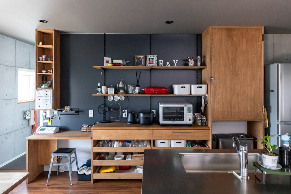 向かって左から作業カウンター、背面収納、食品庫。全て使い方を細かくヒアリングしてつくった造作による一点ものです。
