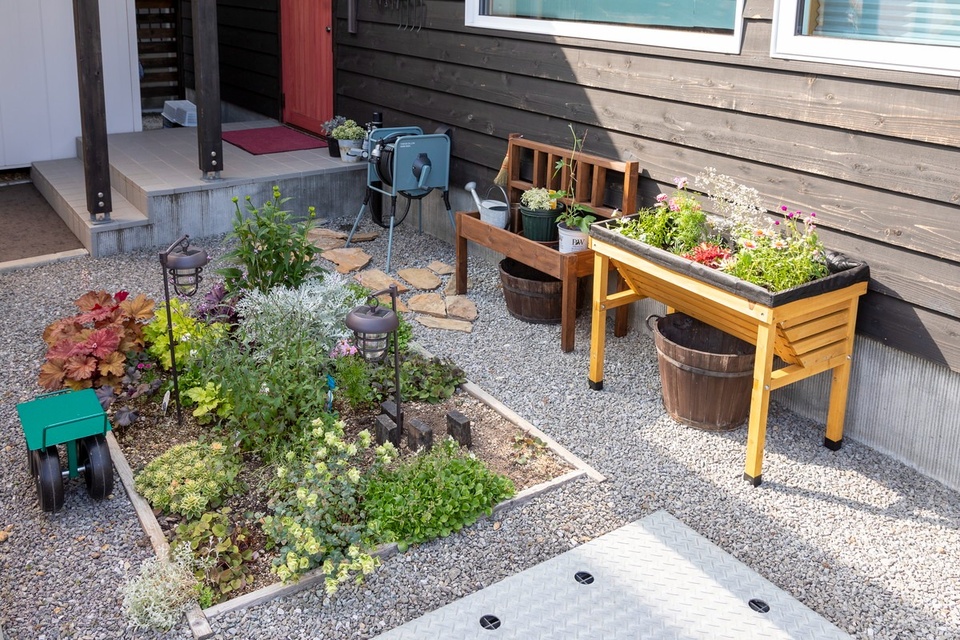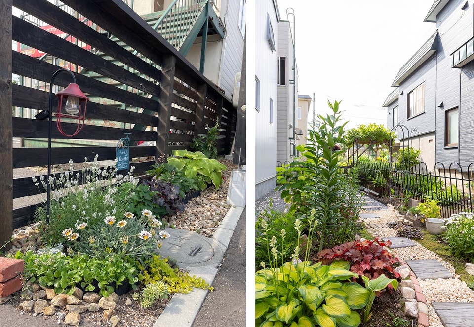 お母さんの手によってカーポートの脇や裏庭まできれいに植栽されており、希望のマイホームでの暮らしを楽しむ息づかいが伝わってきました。