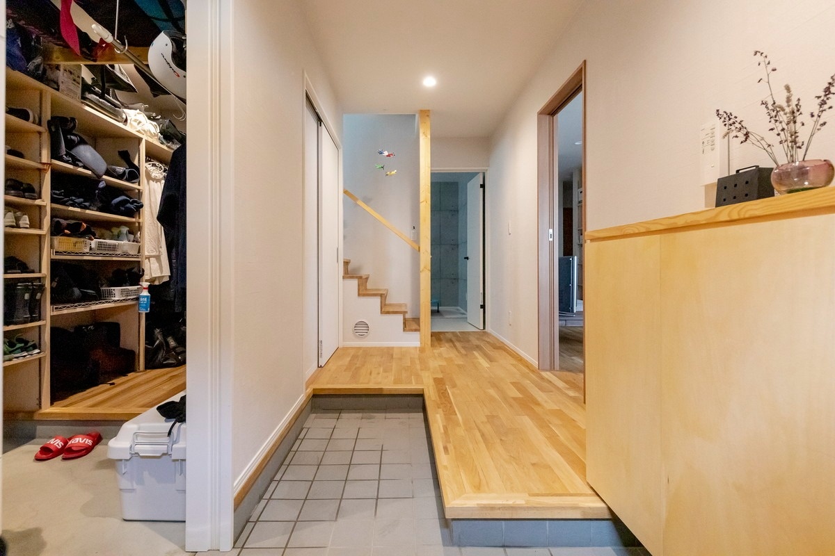 ファミリー玄関も兼ねたクロークは約5帖大!娘さん家族は全員が剣道をやっており、剣道着や袴、面や竹刀の収納場所が必須でした。
