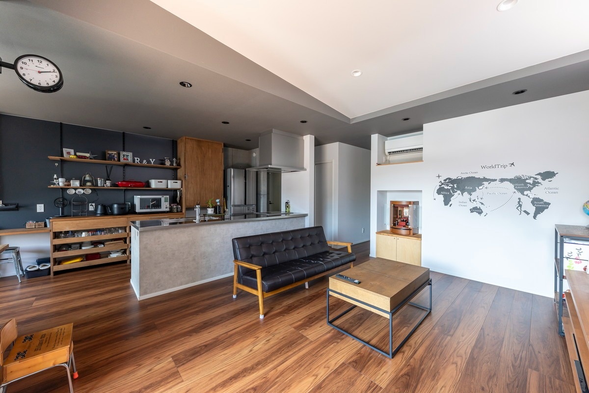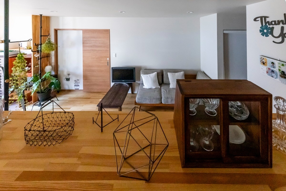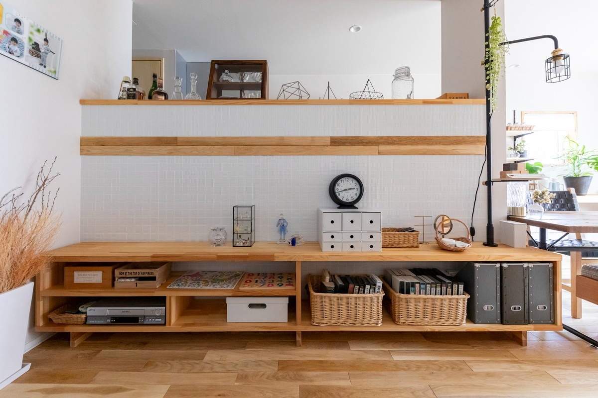 収納を備えた仕切り壁で、キッチンとテレビスペースを緩やかに分離しています。